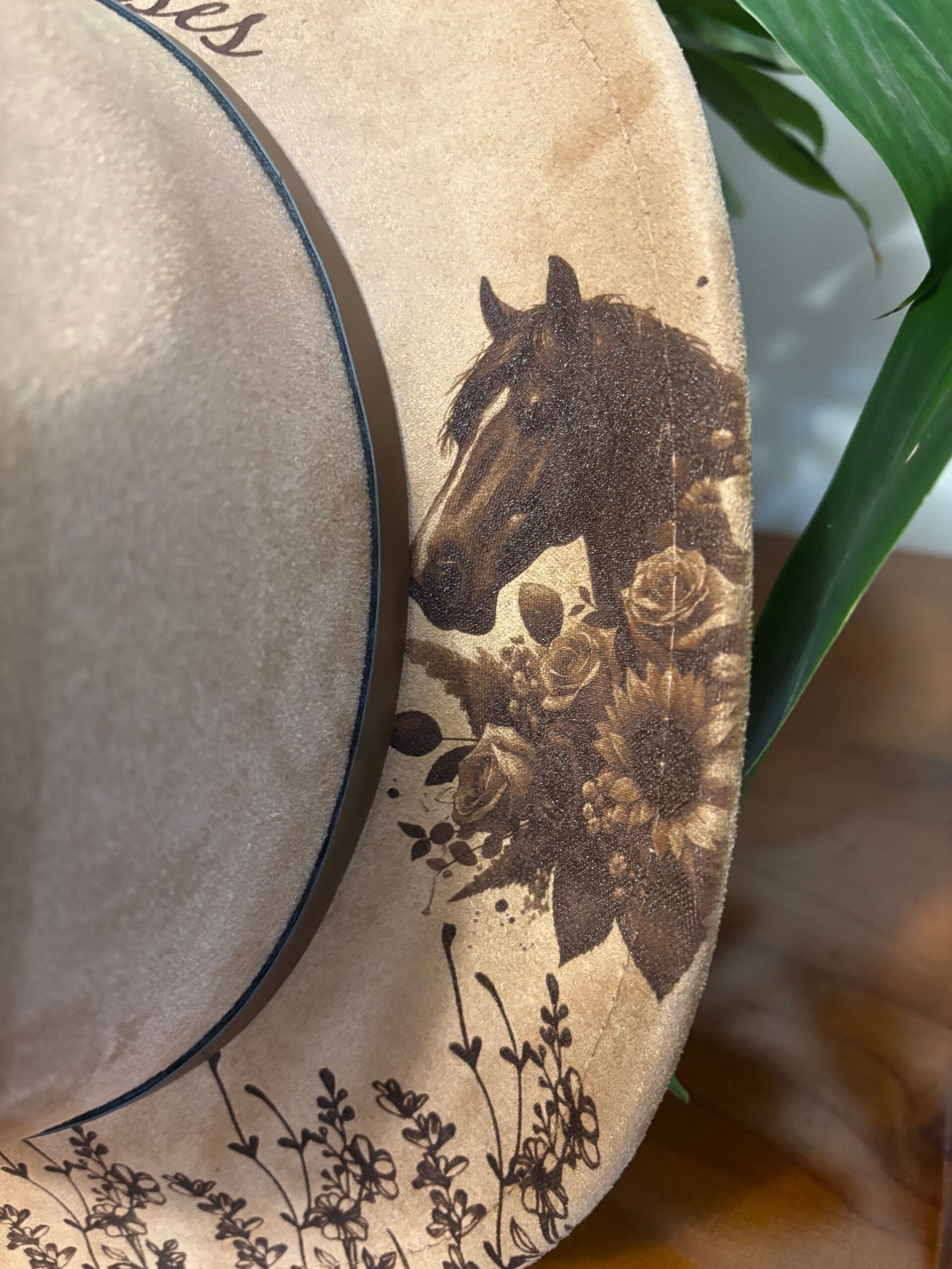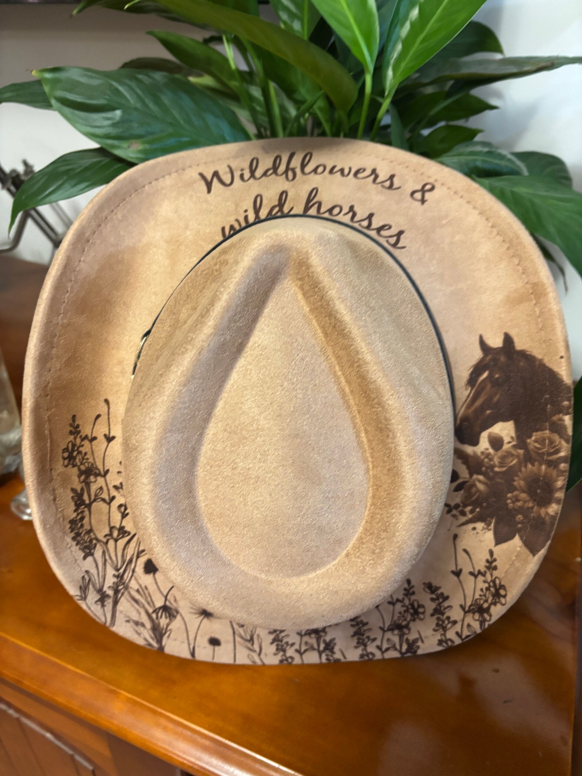 Beautifully laser etched, Wildflowers and Wild horses cowgirl hat.