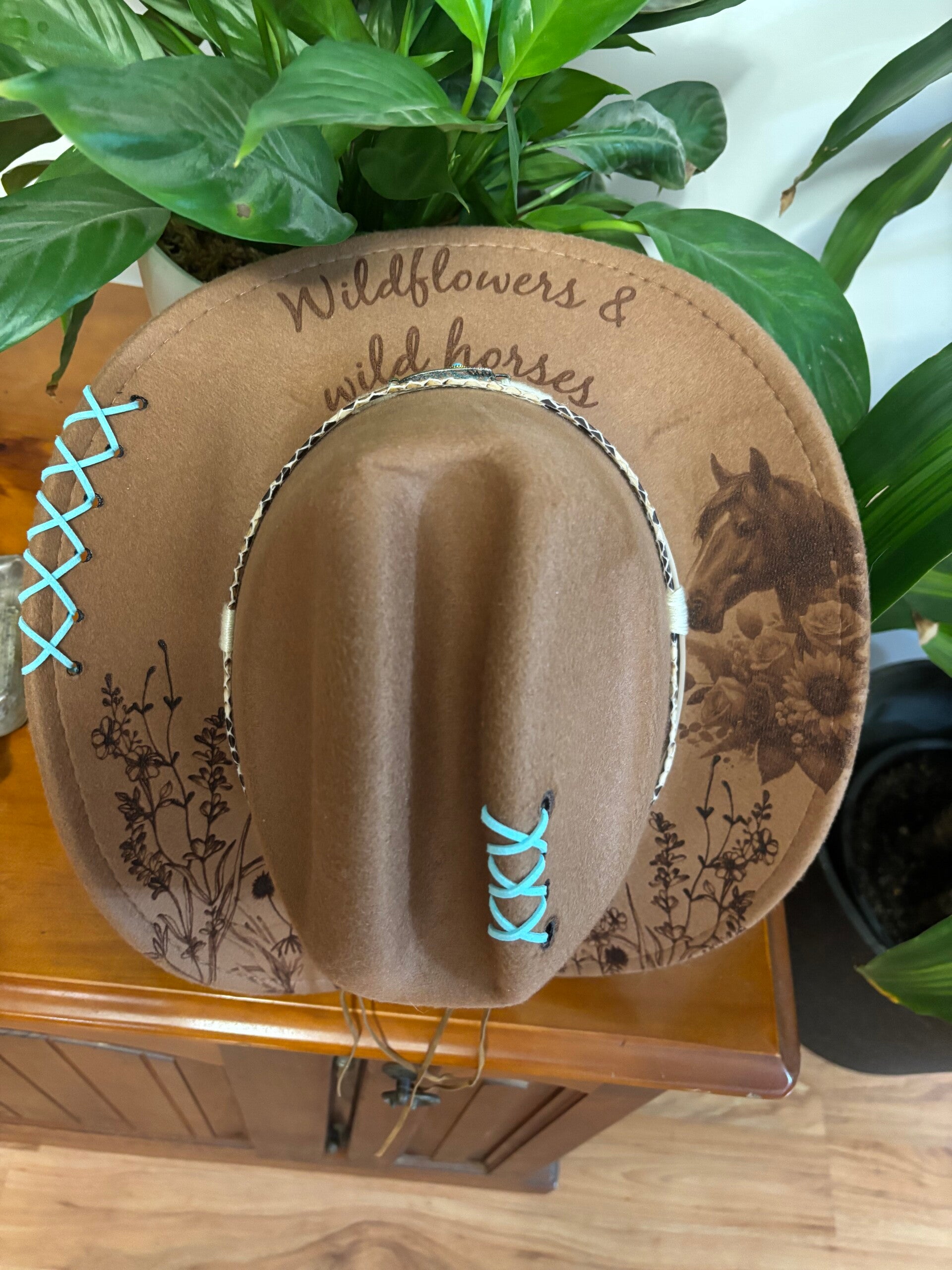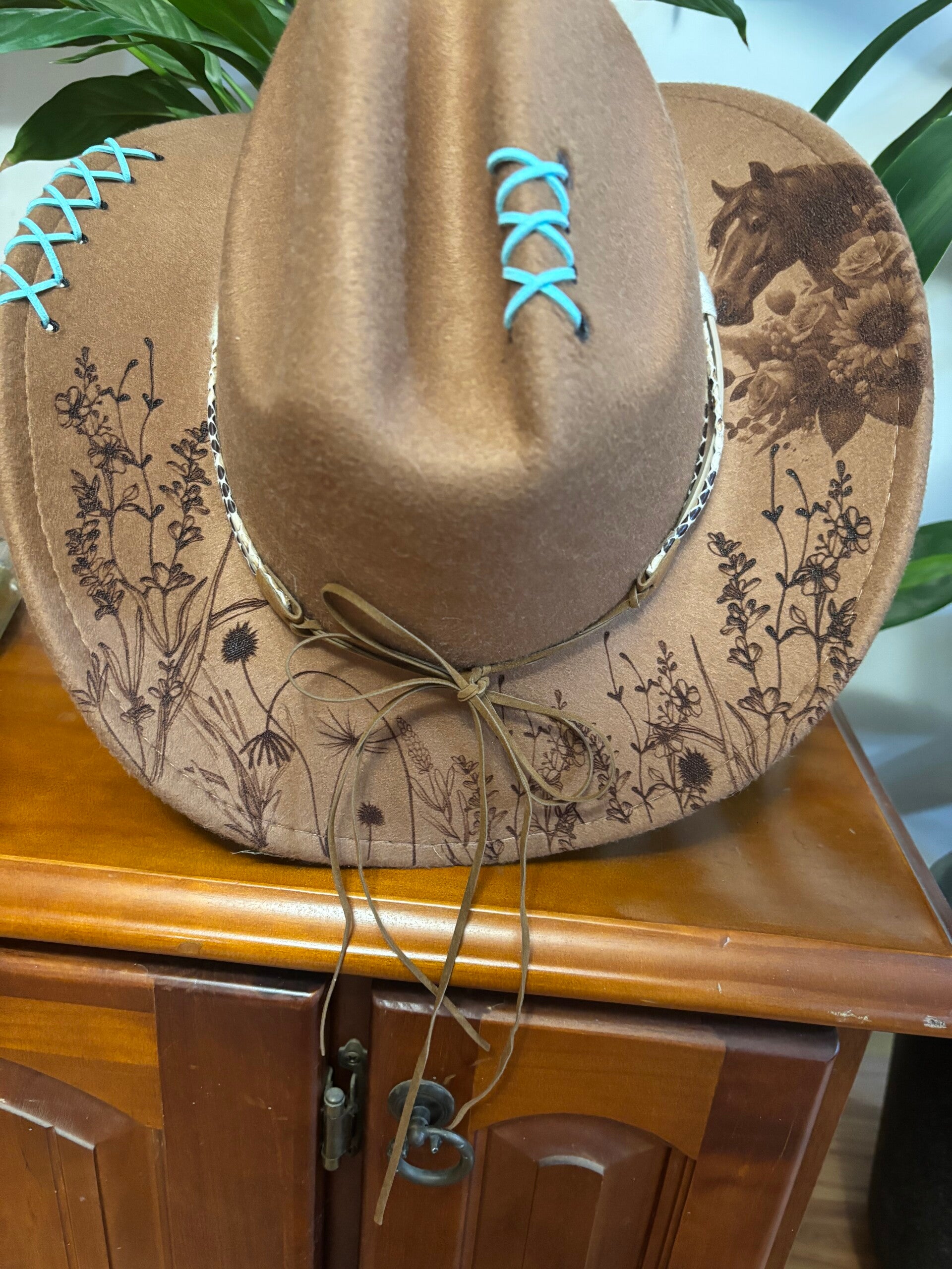 Stunning Wild Soul cowgirl hat with blue lacing, bag sold seperatly.