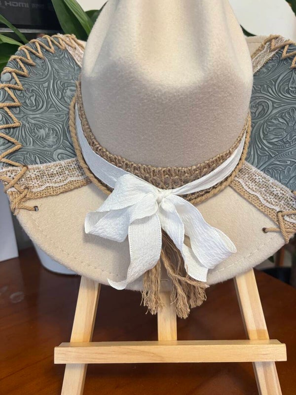 Complimented with a feature of the Faux Leather textured synthetic suede under the brim of hat.
