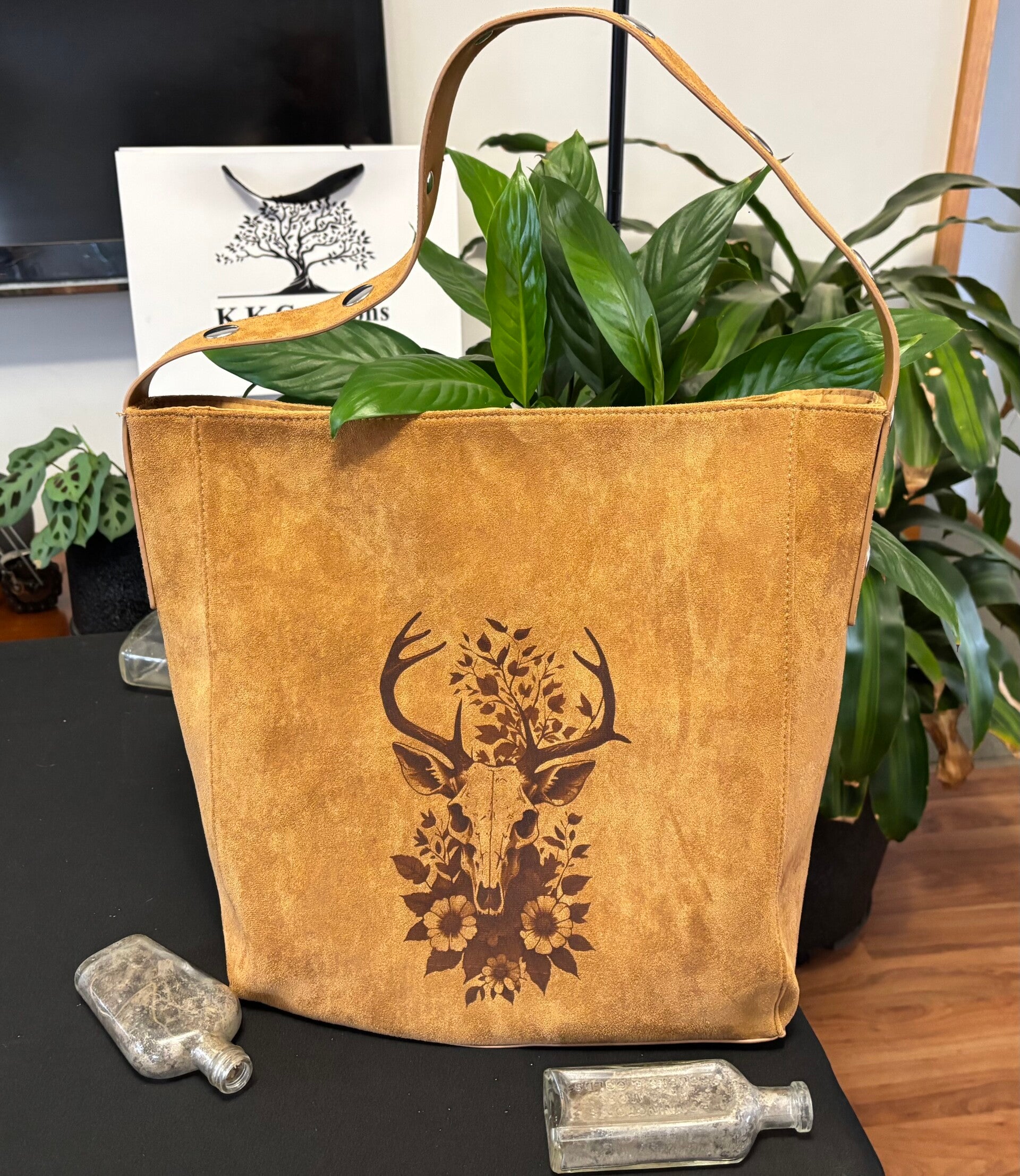 Beautiful laser etched Deer scull and flowers medium size suede type shoulder bag