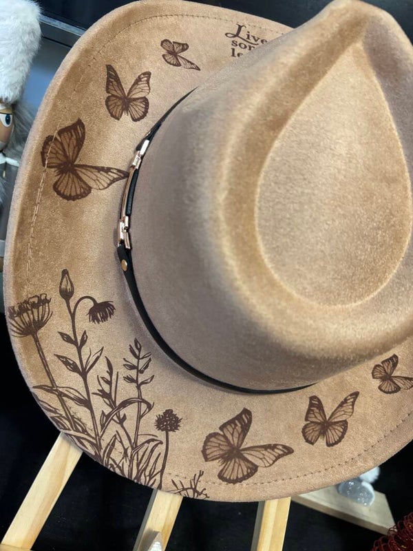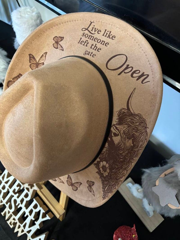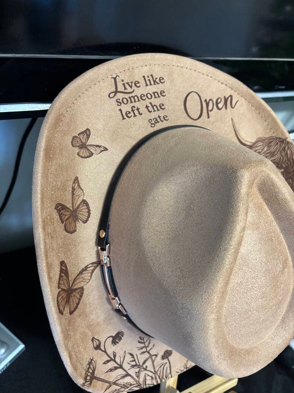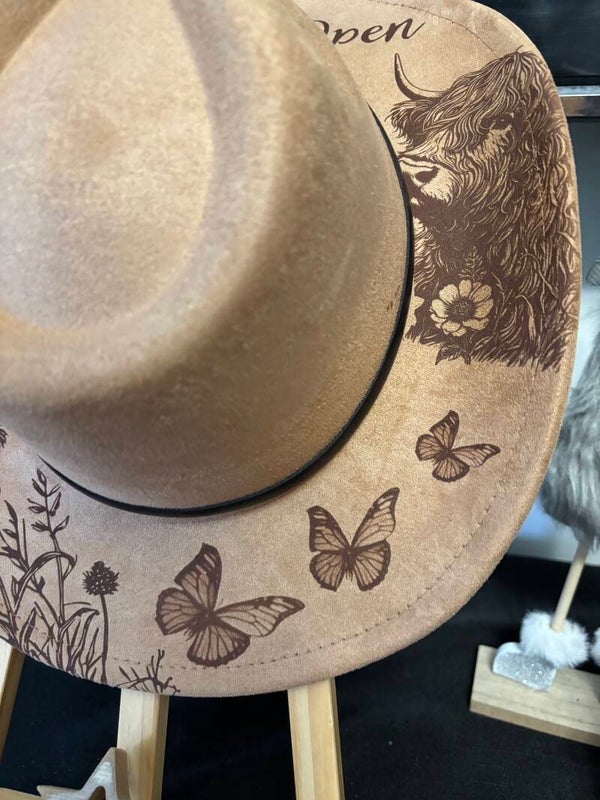 Live like someone left the gate open, Highland Cow, Butterflies and Wildflowers laser etched fedora hat