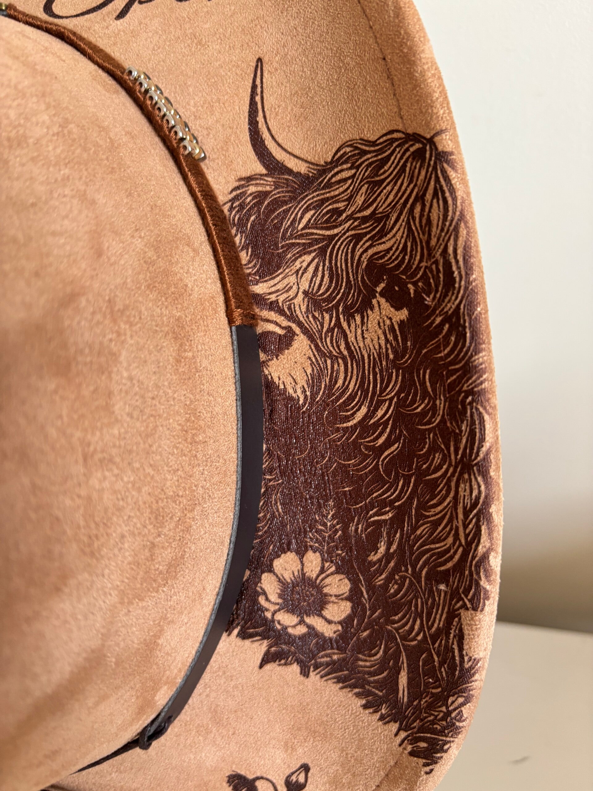 • Highland Cow, butterflies and wildflowers design etched into the brim